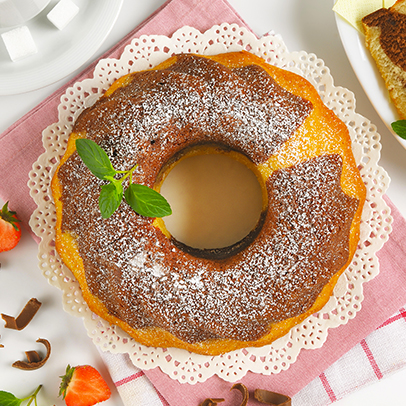 2. Těsto vlijte do předem vymazané bábovkové formy a pečte ve vyhřáté troubě po dobu asi 40 minut. Vychlazenou a již vyklopenou bábovku můžete ještě dozdobit čokoládovou polevou nebo cukrem.